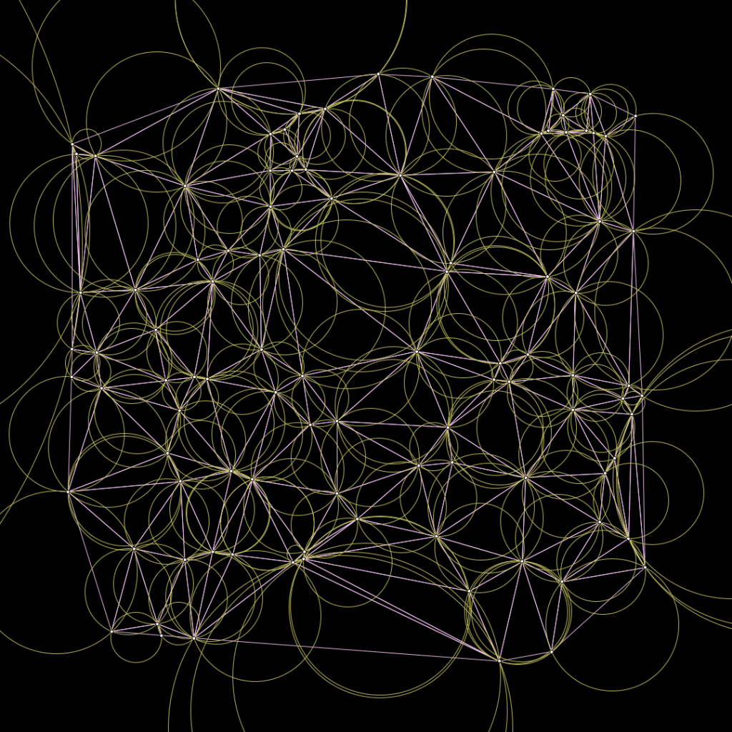 Math turns chaos into structure: first, random points connect, maximizing the minimal angle—Delaunay triangulation emerges. Then, the circumcenters appear, each obeying Delaunay’s golden rule: no point may trespass another’s domain. Finally, by linking these centers, the Voronoi diagram takes shape—a network of fluid, organic boundaries found in nature.
